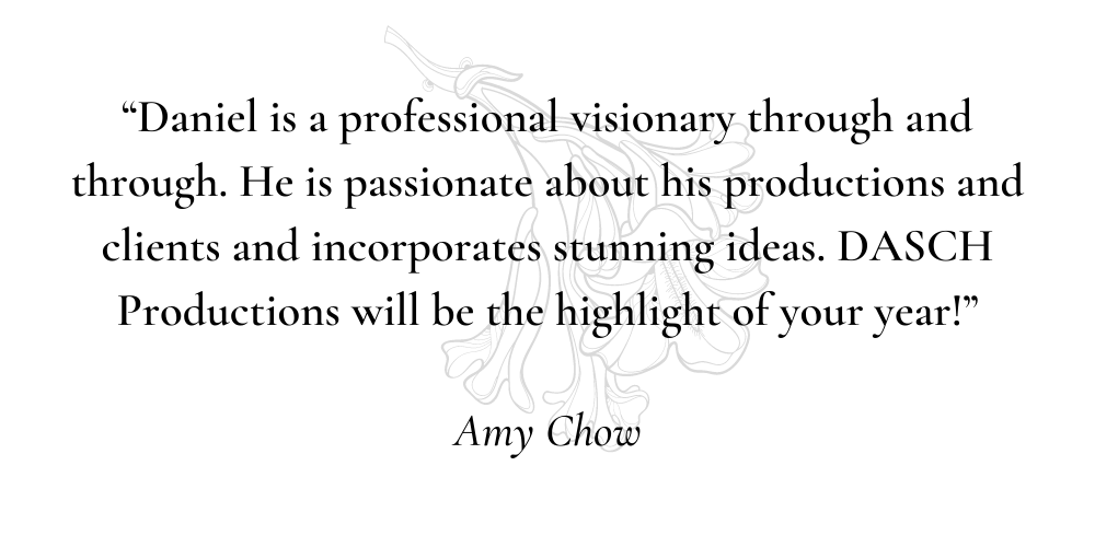 Amy Chow is the Art Director at DASCH Productions and the newly appointed Director of Client Experience with Novalux Weddings. She cultivates designs that represent DASCH clients, their events, and their media. Amy works behind the scenes - developing social media, creating digital and print designs, implementing stylized decor - ensuring our clients' voices are strong and clear.